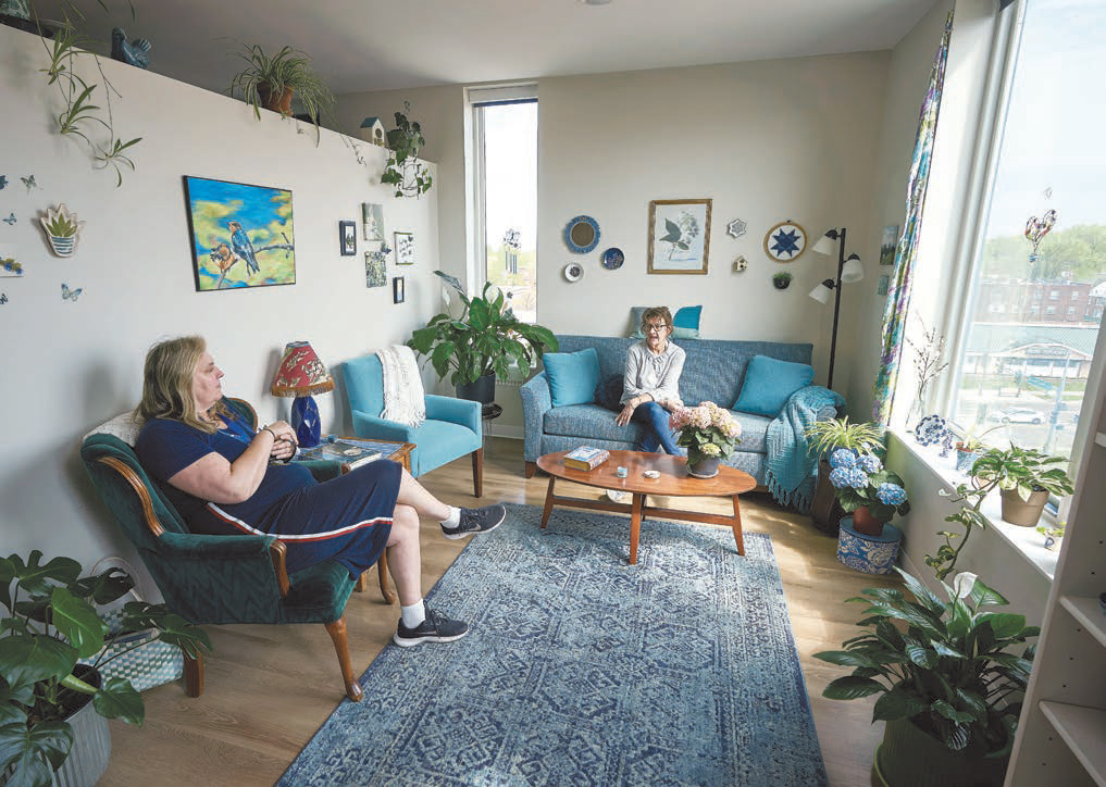 Located on the site of a former Ford plant, Highland Bridge is a mixed-use neighborhood along the Mississippi River, combining residences, offices, retail spaces, and parks in a walkable, sustainable environment. At its heart is Restoring Waters, a four-story building with 60 apartments that are currently home to 55 women and five men. Twenty-seven of the women moved from the old downtown facility, and Emma Norton staff worked with county officials to identify the others. All have experienced long-term homelessness and also face mental health and/or substance abuse challenges. Two residents have children living with them, and Nelsen-Wills said they expect that number will increase with future residents. Several residents are parents or grandparents who now have a safe home for kids to visit.