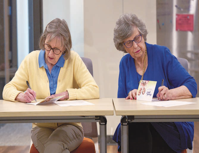 Ann Girres (left) and Shirley Jackson, both members of the board of directors of Emma Norton Services, sign thank you notes to people who have donated to Restoring Waters, a housing project in St. Paul, Minnesota, for women and others who are homeless and also wrestle with mental health and/or substance abuse challenges. Girres is president of the board. Both women are members of United Women in Faith and long-time
